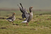 Gefiederputzen bei Graugänsen, wenn zwei gegensätzliche Impulse (Flucht und Angriff) aufeinander trafen. Auch Menschen können mit solch sinnlos scheinenden Handlungen auf innere Konflikte